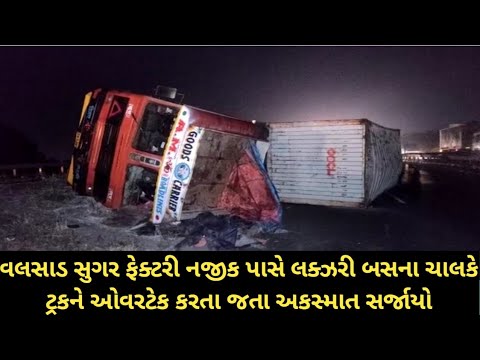 વલસાડ સુગર ફેક્ટરી નજીક પાસે લક્ઝરી બસના ચાલકે ટ્રકને ઓવરટેક કરતા જતા અકસ્માત સર્જાયો | જુઓ વિડિઓ